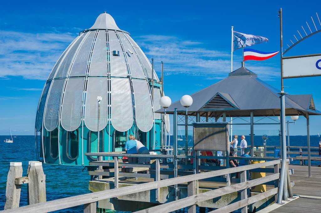 Die Seebrücke Grömitz ist nicht nur funktional, sondern auch ästhetisch ansprechend. Mit ihrer Länge von 398 Metern erstreckt sie sich weit in die Ostsee hinein. Ein Highlight der Seebrücke ist der Seebrückenkopf, der sich mit seiner markanten Tauchgondel fast schon futuristisch zeigt. Diese Gondel taucht bis zu 4 Meter tief in die Ostsee ab und bietet eine einmalige Perspektive auf das Leben unter Wasser. Zudem gibt es entlang der Brücke zahlreiche Bänke und Aussichtsplattformen, die zum Verweilen und Genießen der Aussicht einladen.